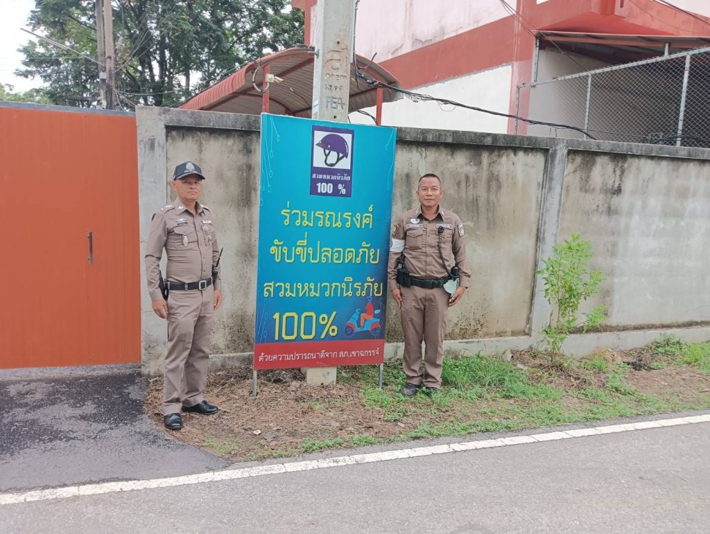 ขับขี่ปลอดภัยสวมหมวกกันนะครับ วันที่ 21 ก.พ. 2568 พ.ต.ท.มาโนทย์ สิทธิผล ปรก.สวป.สภ.เขาฉกรรจ์ และเจ้าหน้าที่ตำรวจ สภ.เขาฉกรรจ์ ร่วมติดป้ายประชาสัมพันธ์โครงการสวมหมวกนิรภัย 100% โรงเรียนเขาฉกรรจ์วิทยาคม