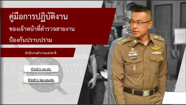 คู่มือการปฏิบัติมาตรฐานสำหรับเจ้าหน้าที่สายตรวจและเจ้าหน้าที่ผู้ประสพเหตุ 2559 คลิ๊กที่ภาพ คู่มือการปฏิบัติงานของตำรวจสายตรวจ 2553 คลิ๊กที่ภาพ คู่มือการบริหารงานป้องกันและปราบปรามอาชญากรรม พ.ศ.2561 คลิ๊กที่ภาพ คู่มือการปฏิบัติงานของเจ้าหน้าที่ตำรวจสายตรวจงานป้องกันปราบปราม พ.ศ.2564 คลิ๊กที่ภาพ คู่มือการควบคุมและการจัดสายตรวจ คลิ๊กที่ภาพ แนวทางการปฏิบัติแนวทางการปฏิบัติงานด้านมวลชนสัมพันธ์สำหรับข้าราชการตำรวจต่อศาสนิกชนต่างๆ คลิ๊กที่ภาพ